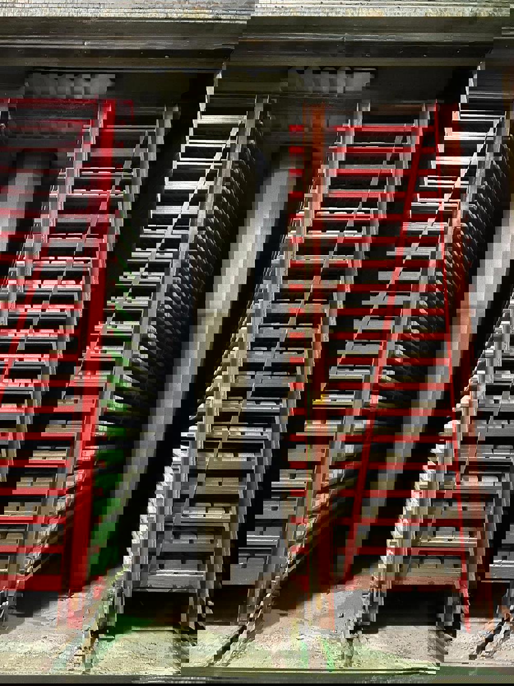Unieke kijkje in een lege droogkamer tijdens de onderhoudswerkzaamheden die momenteel worden uitgevoerd. De zuilen blazen normaal gesproken warme lucht rond, hierbij wordt gebruik gemaakt van restwarmte van de oven.